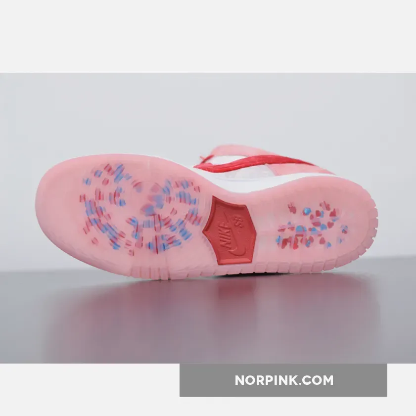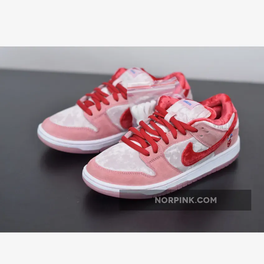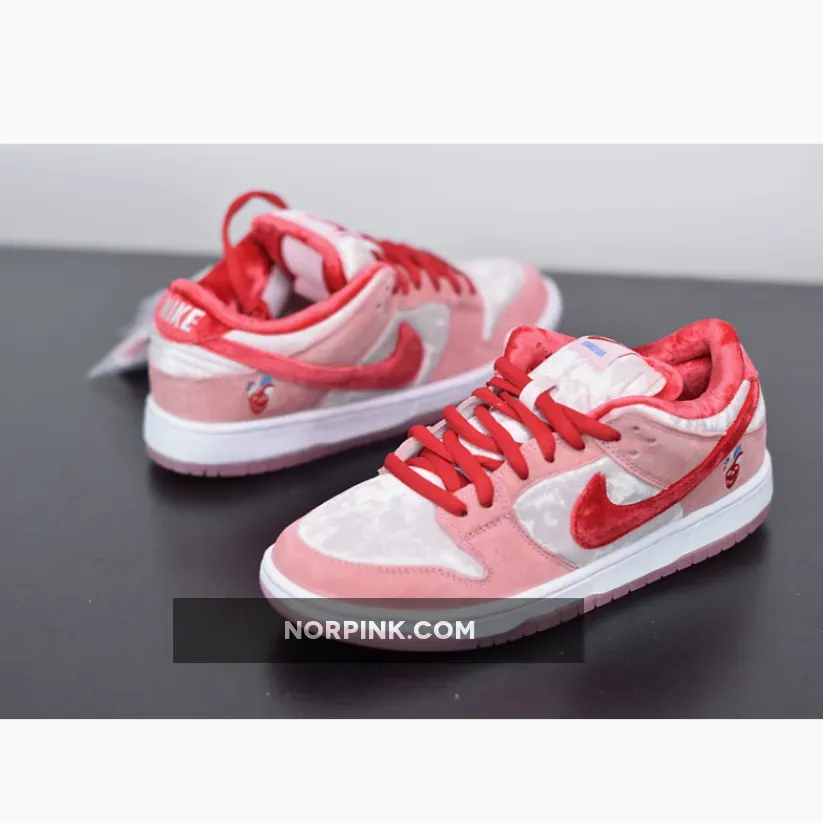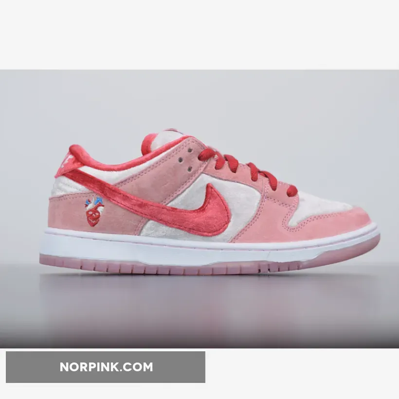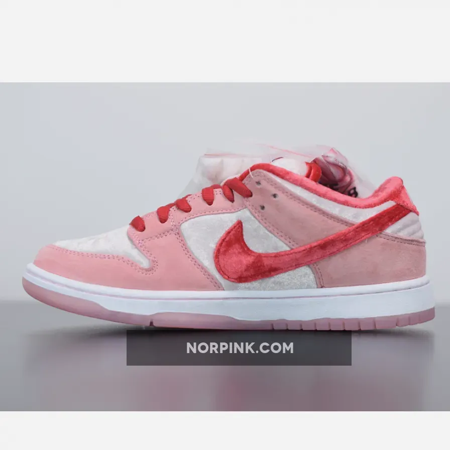 The Nike SB Dunk Low StrangeLove Skateboards (Regular Box) is a stylish and luxurious sneaker that features a pink velvet upper with suede overlays and a red velvet Swoosh. The Strangelove branding on the tongue, insole, and translucent outsole completes the design of the sneaker. The sneaker was made in Italy with the finest materials and craftsmanship. Get ready to turn heads with these sneakers.