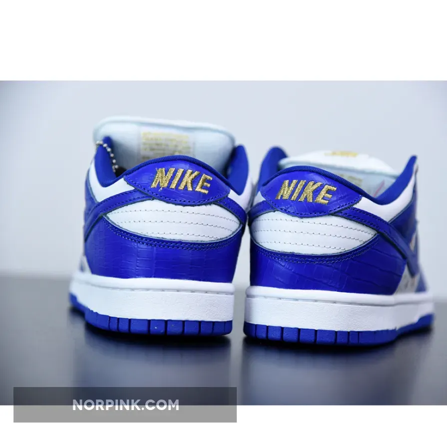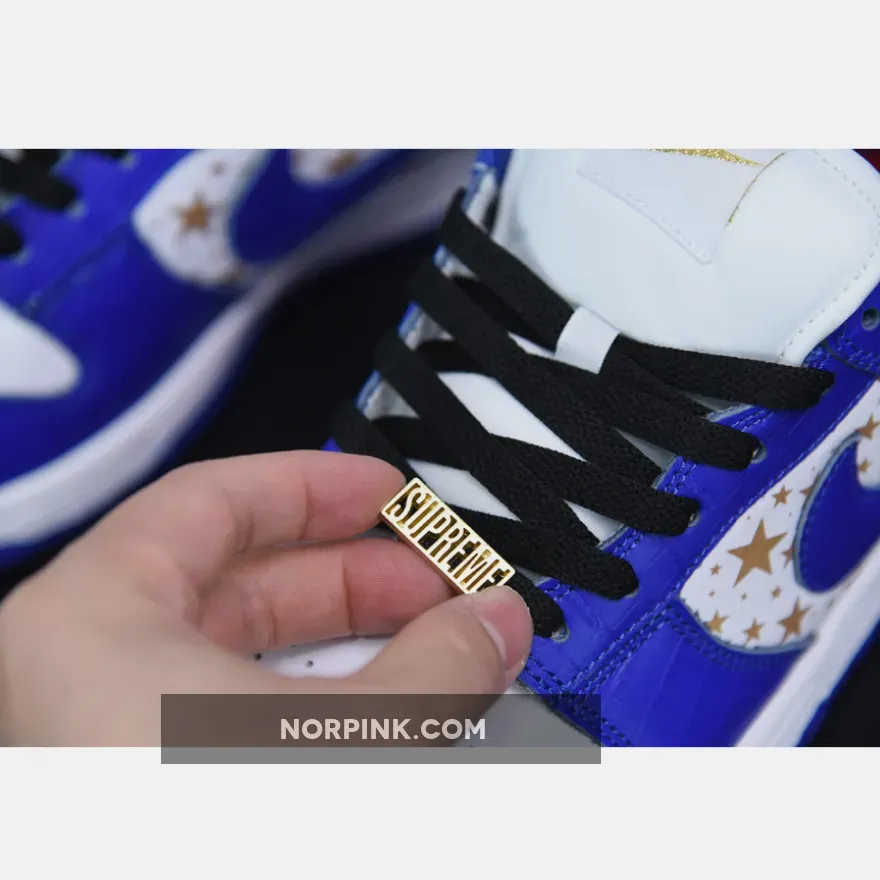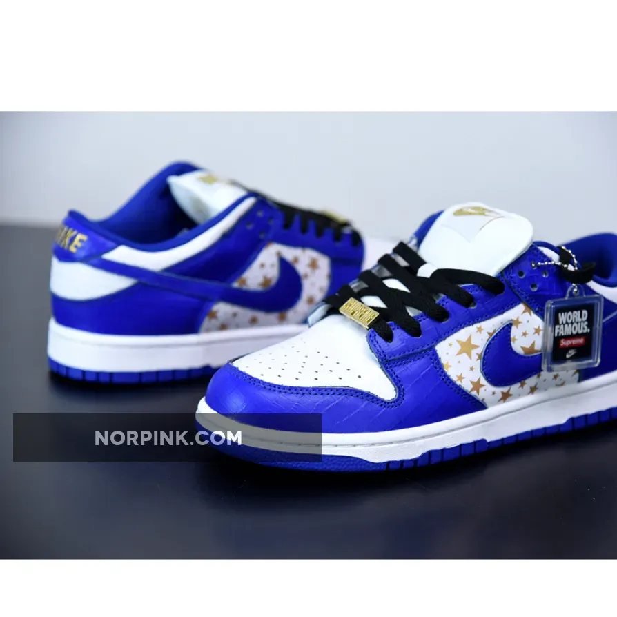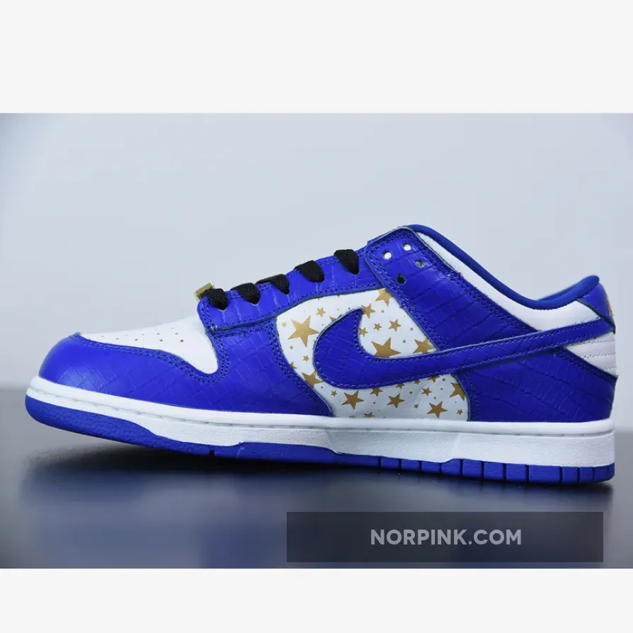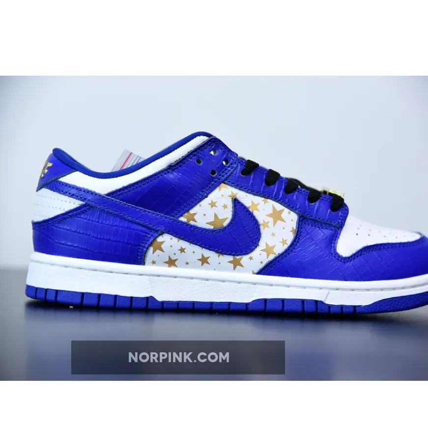 Phenomenal! ? The Supreme x Nike SB Dunk Low Stars Hyper Blue features a classic design with modern twist. Gold stars & croc overlays pop, colorway is fire. ? #MustHave #SneakerGame ?!