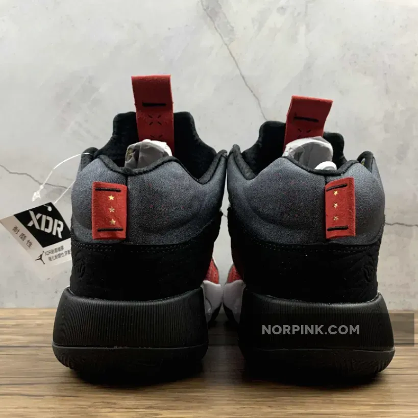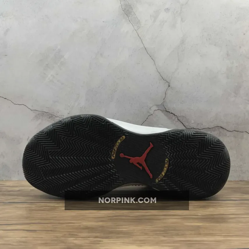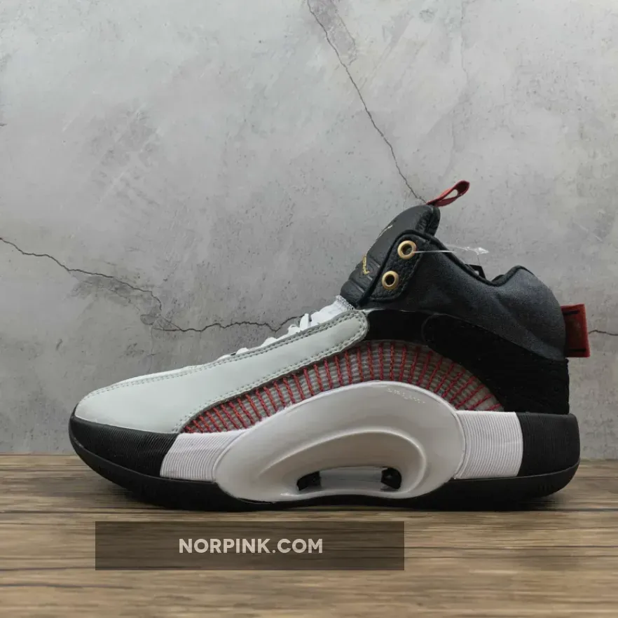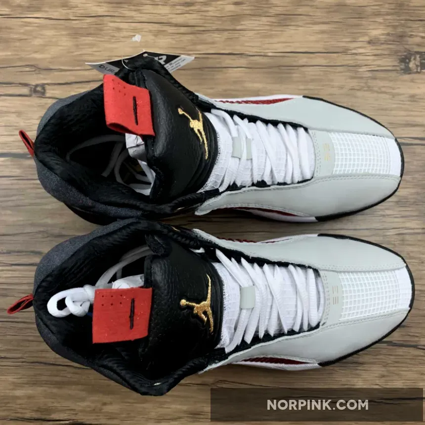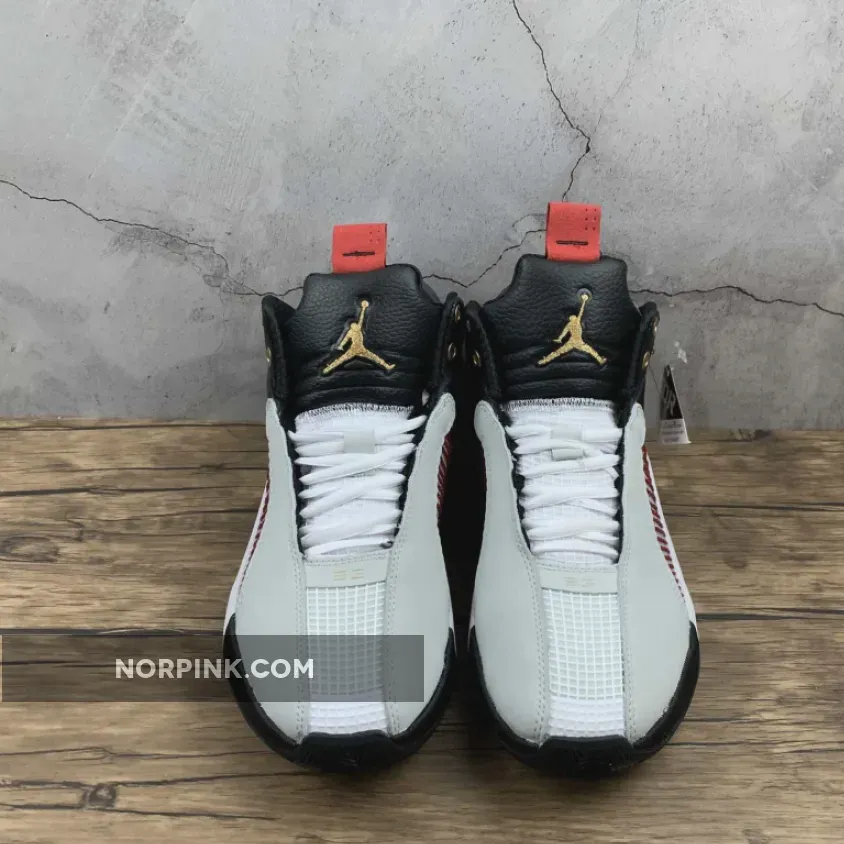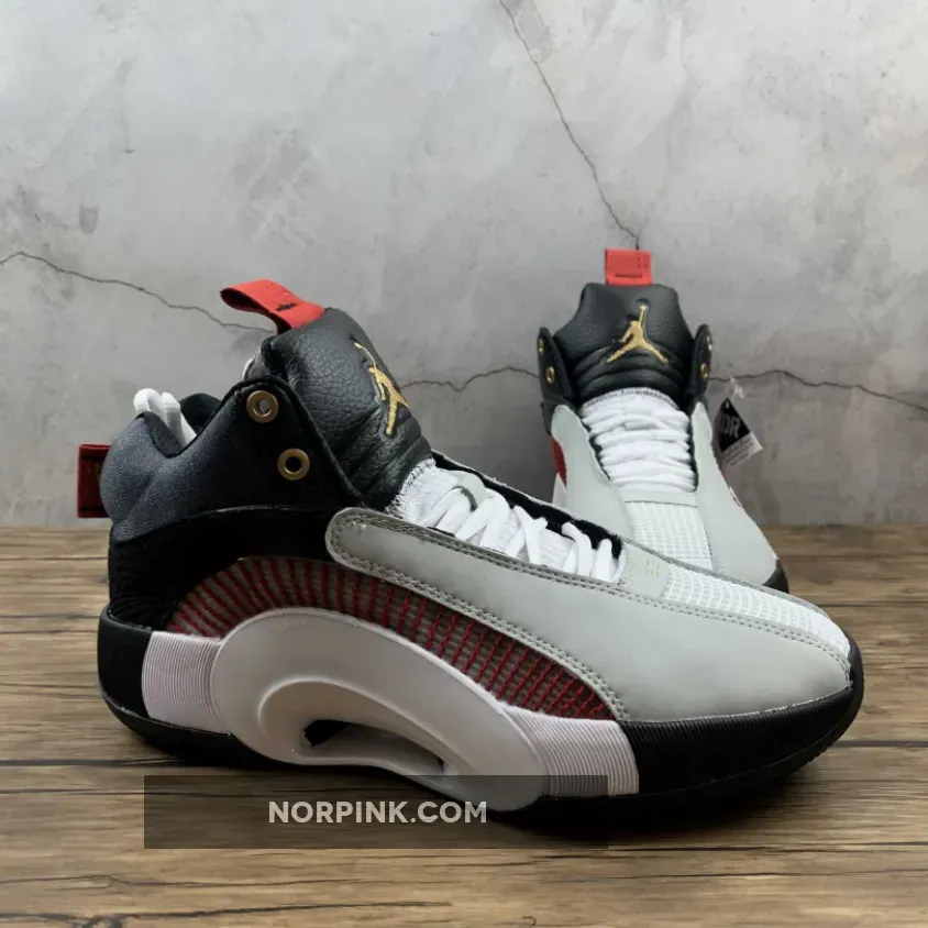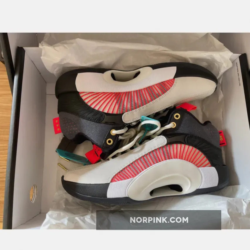Collars, tongues, and outsoles all arrive in black, while the pair’s suede forefoot overlay and midfoot eclipse plates take on an elegant shade of off-white. wedged in between those in the Air Jordan 5-inspired netting in a vibrant crimson hue, with further flashes of the color found at the tongue pull and rear tag. Crisp whites at the midsole and tongue add some sharp contrast to the surrounding bones, and the pair is complete with metallic gold finishes at the upper eyelets, tongue branding, and co-branded insoles.