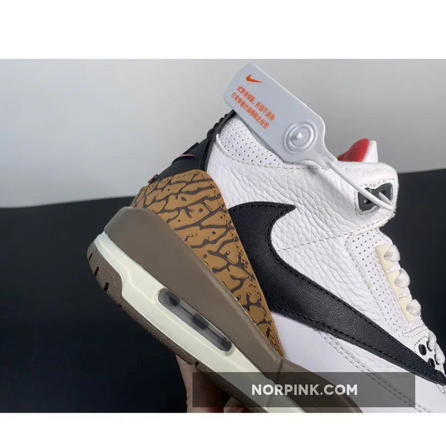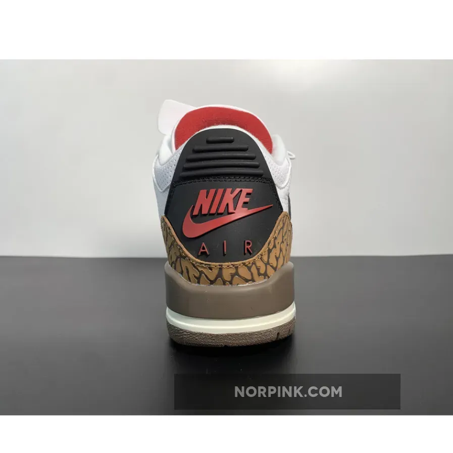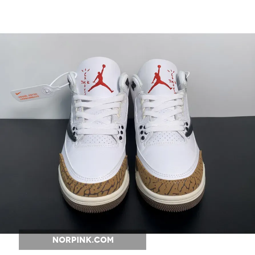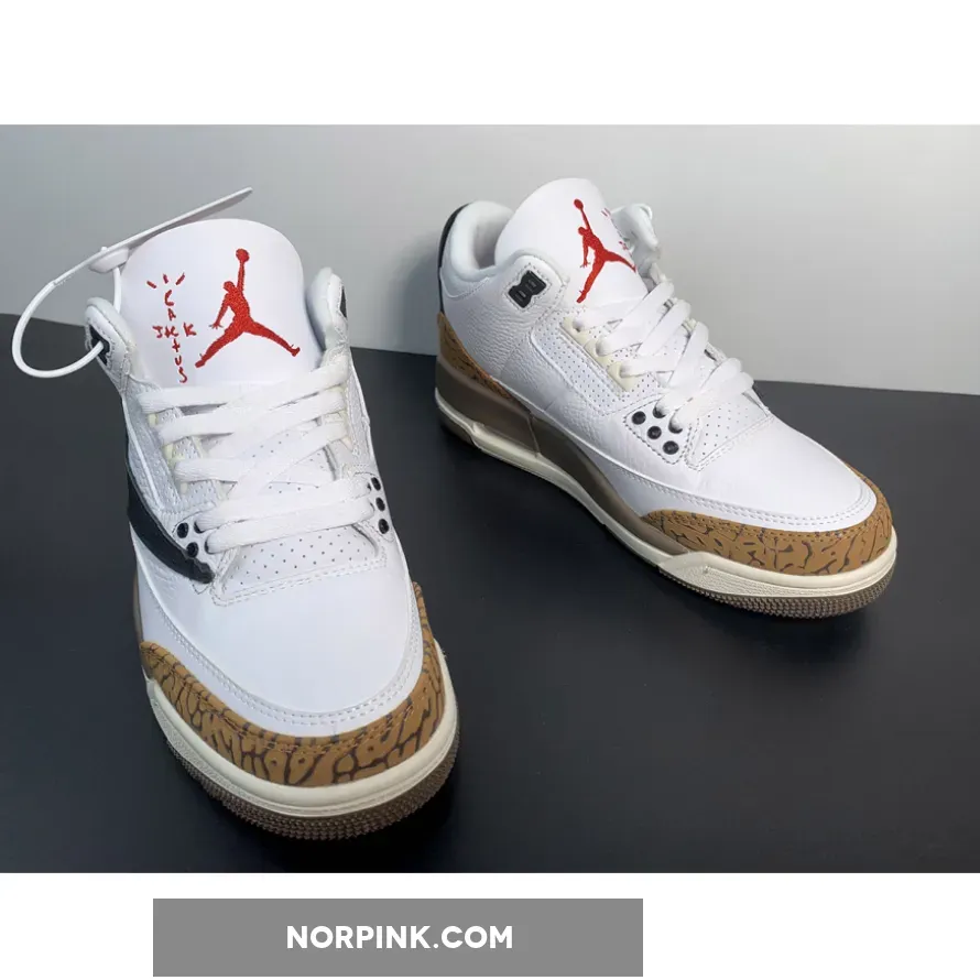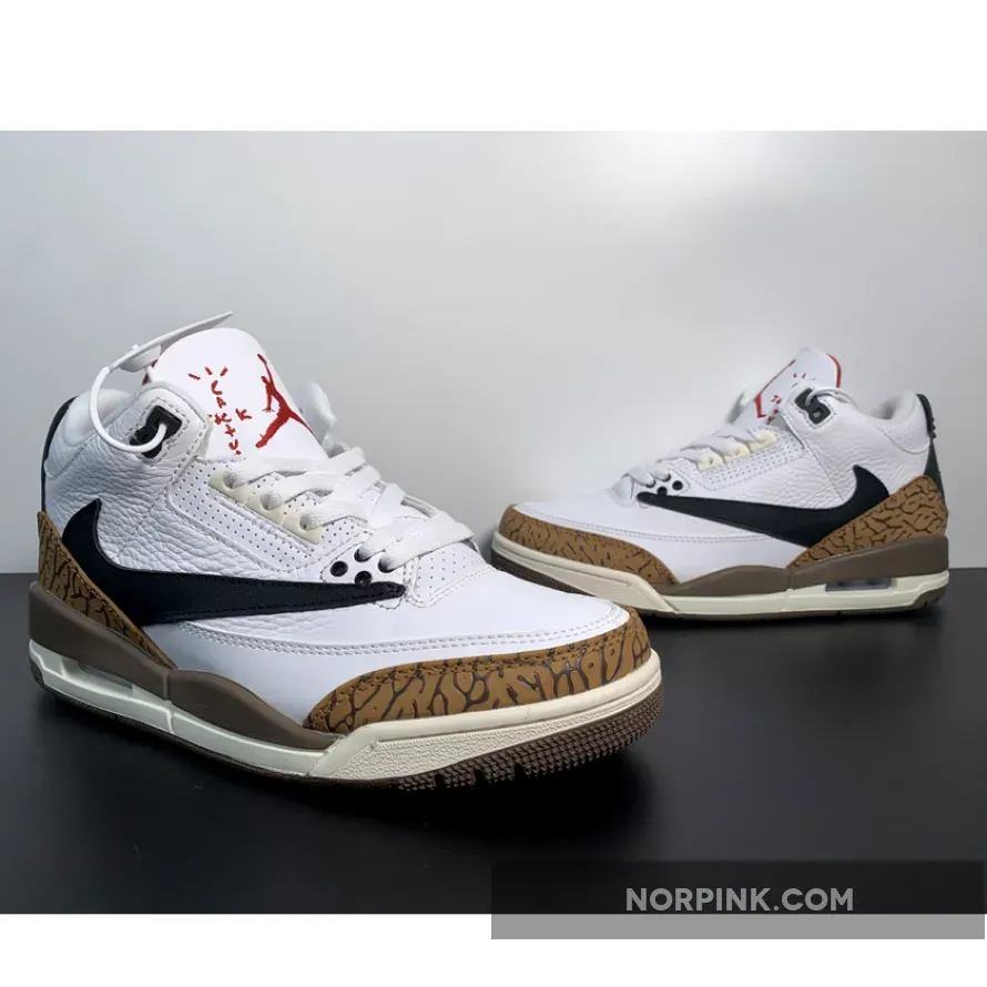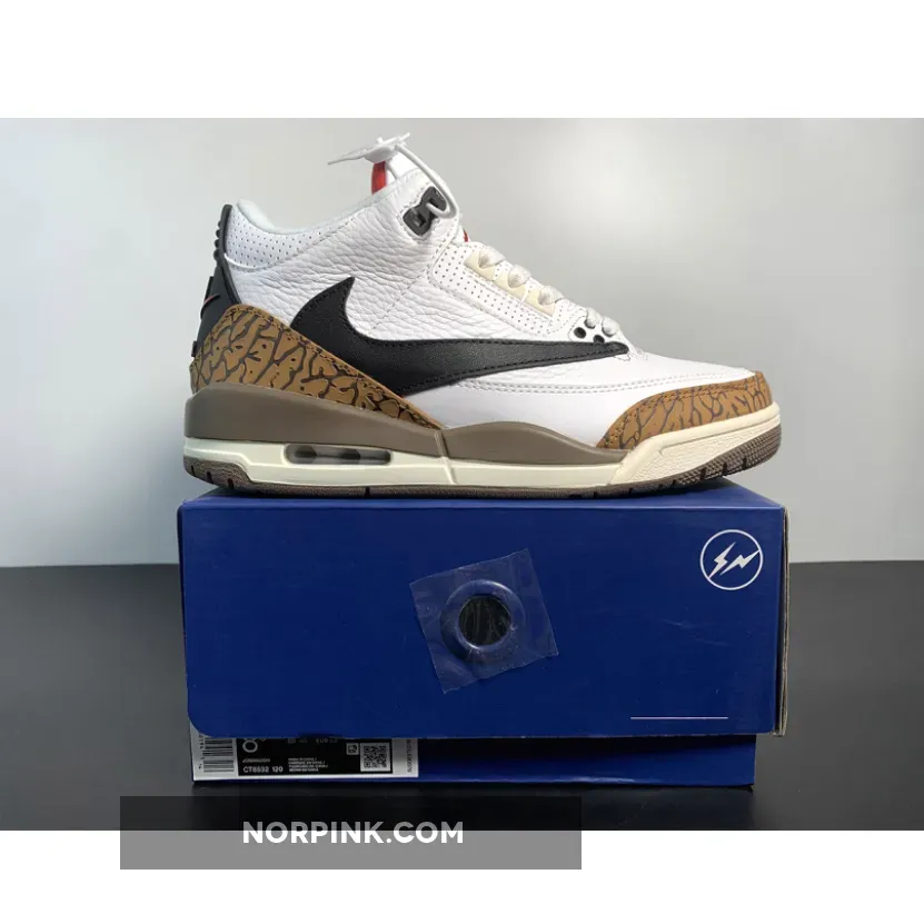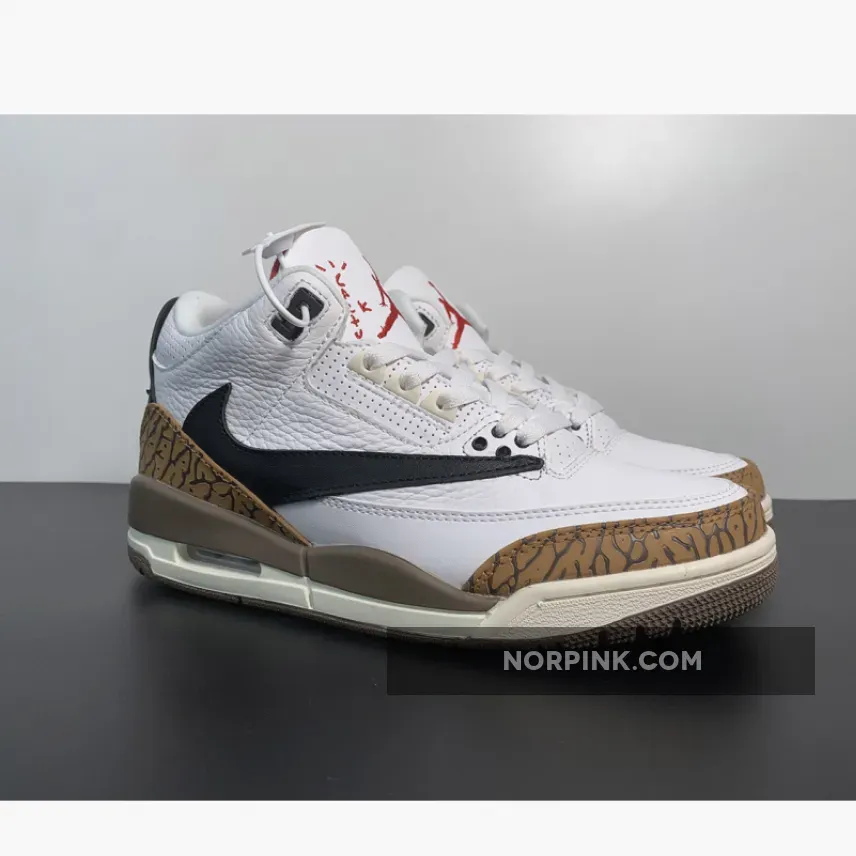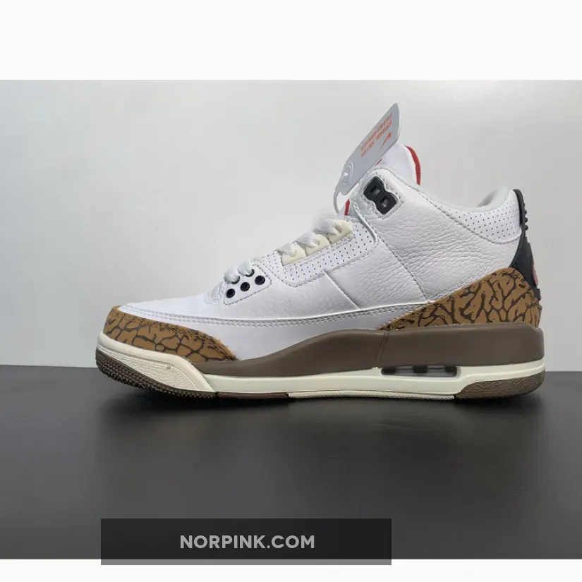 The upper of the shoe is clad in a “White / Tan / Brown / Black” color scheme. The base of the shoe is clad in a plain white hue, which is disturbed by the iconic elephant print on the heels and mudguards. The branding elements are added to the heel counters and the visible air unit on the midsole.