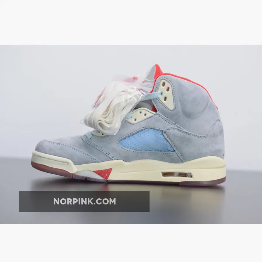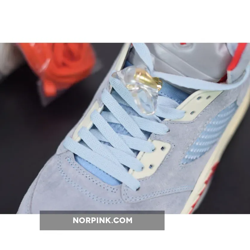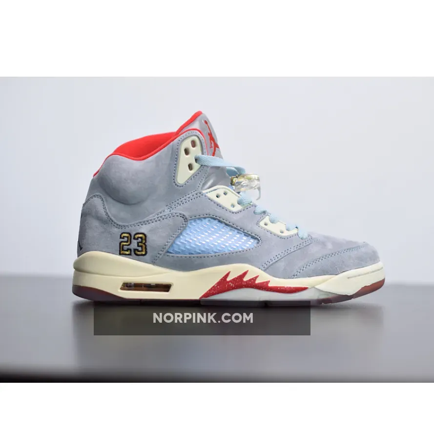 One pair features an Ice Blue upper with University Red accents atop a Sail midsole, while the other sports a University Red upper with Ice Blue accents atop a Black midsole. Both are completed with Trophy Room branding and embroidered number “5” on the heels atop icy translucent outsoles.