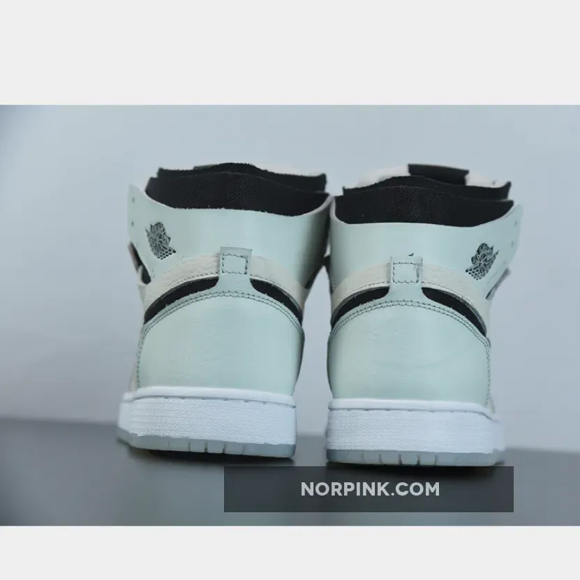 Dressed in a White, Grey Heather, Olive Aura, and Khaki color scheme. This Air Jordan 1 features a leather upper covered in pastel hues with Black cut-out mesh Swooshes, Zoom Air leather tongue tags, laces, Wings logo, and insoles. A White and semi-translucent full-length Zoom Air cushioning completes the design.